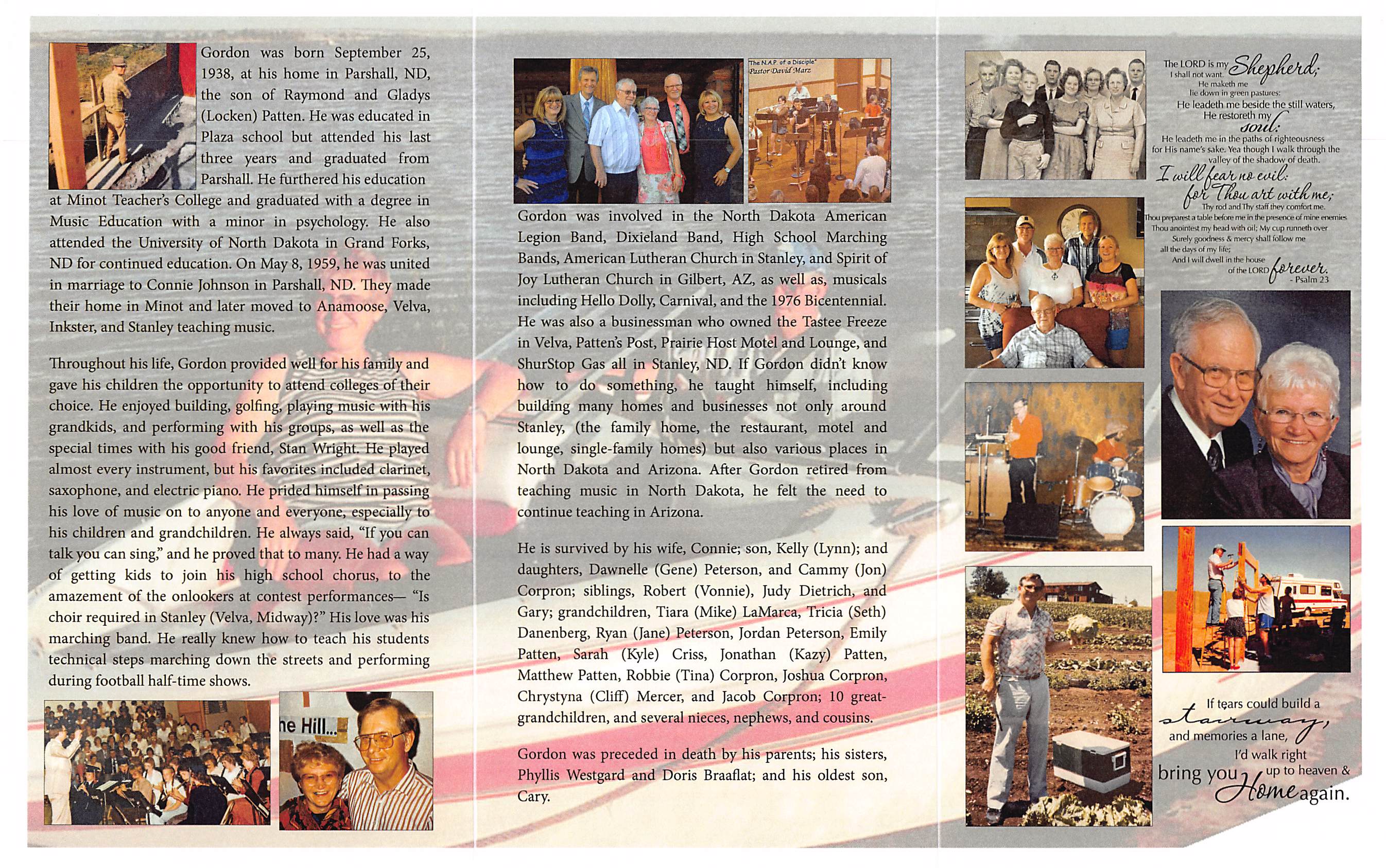 Gordon was born September 25, 1938, at his home in Parshall, ND, the son of Raymond and Gladys (Locken) Patten. He was educated in Plaza school but attended his last three years and graduated from Parshall. He furthered his education at Minot Teacher’s College and graduated with a degree in Music Education with a minor in psychology. He also attended the University of North Dakota in Grand Forks, ND for continued education. On May 8, 1959, he was united in marriage to Connie Johnson in Parshall, ND. They made their home in Minot and later moved to Anamoose, Velva, Inkster, and Stanley teaching music.